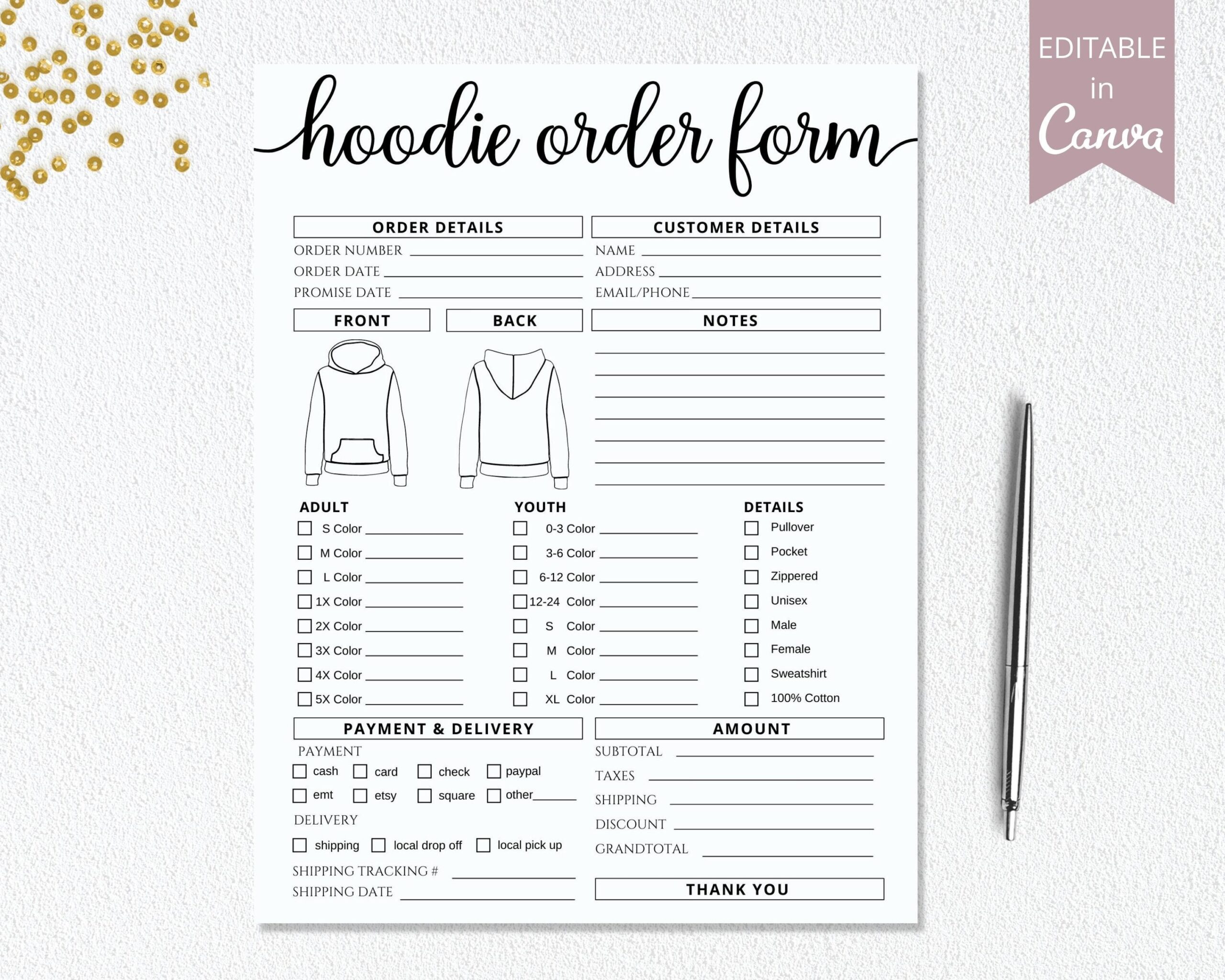 Hoodie Order Form Template I Editable Canva Invoice Template I T shirt Small Business Form I Custom Order Form Printable I Crafters Forms Etsy